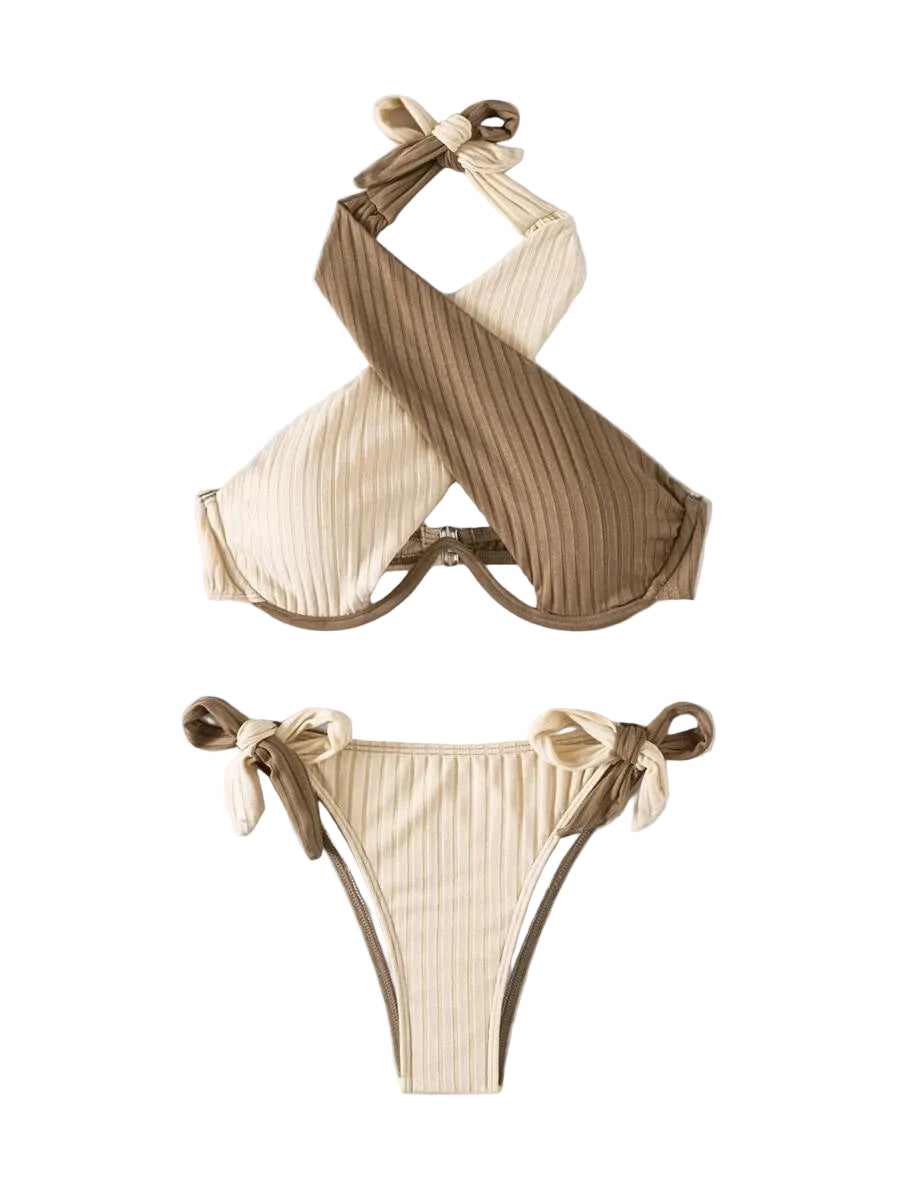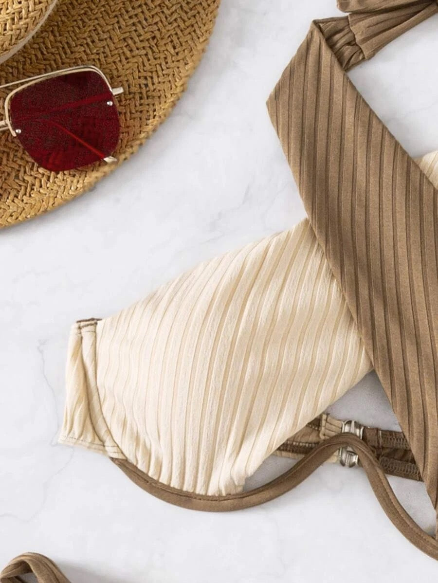 Bikini Damen Badeanzug Zweifarbig Hängender Ausschnitt Gekreuzter Rücken Schmale Rückenpartie