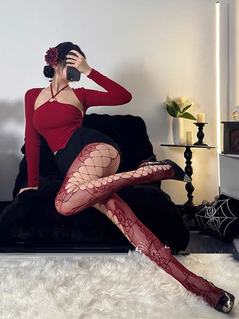 Schwarze Netzstrümpfe mit Rosenmuster und seitlichem Karomuster für Damen