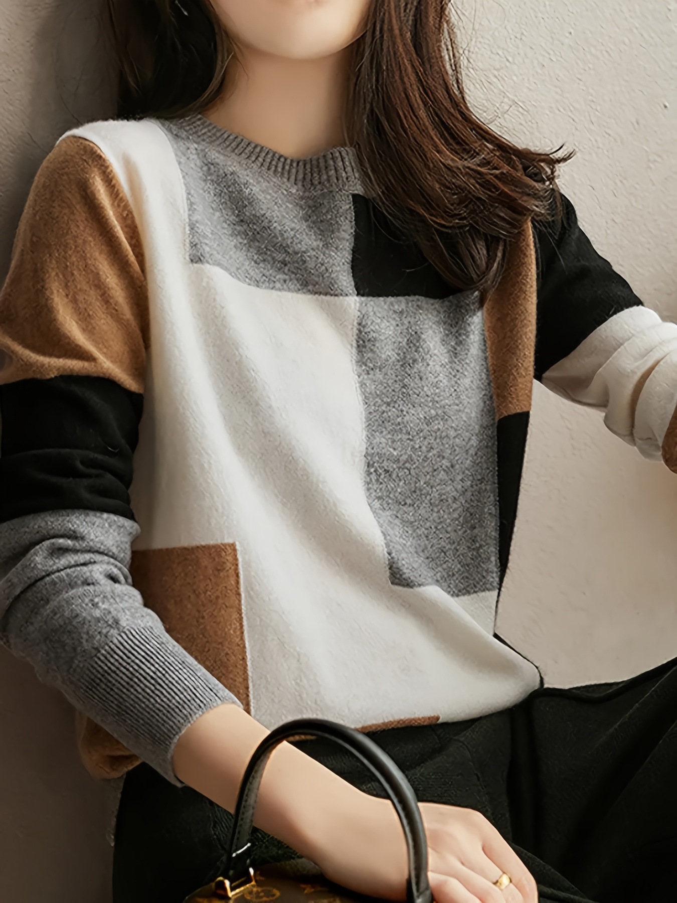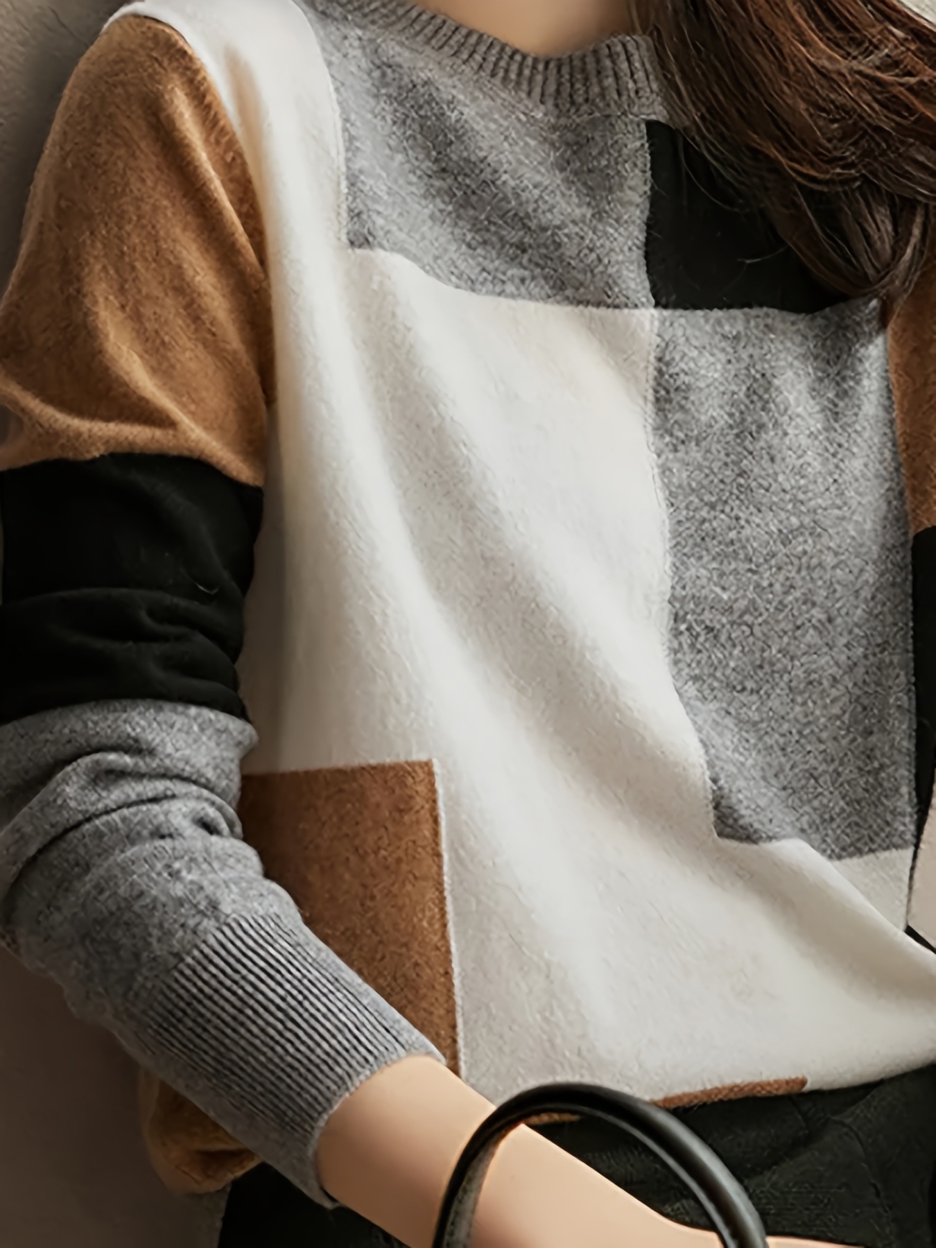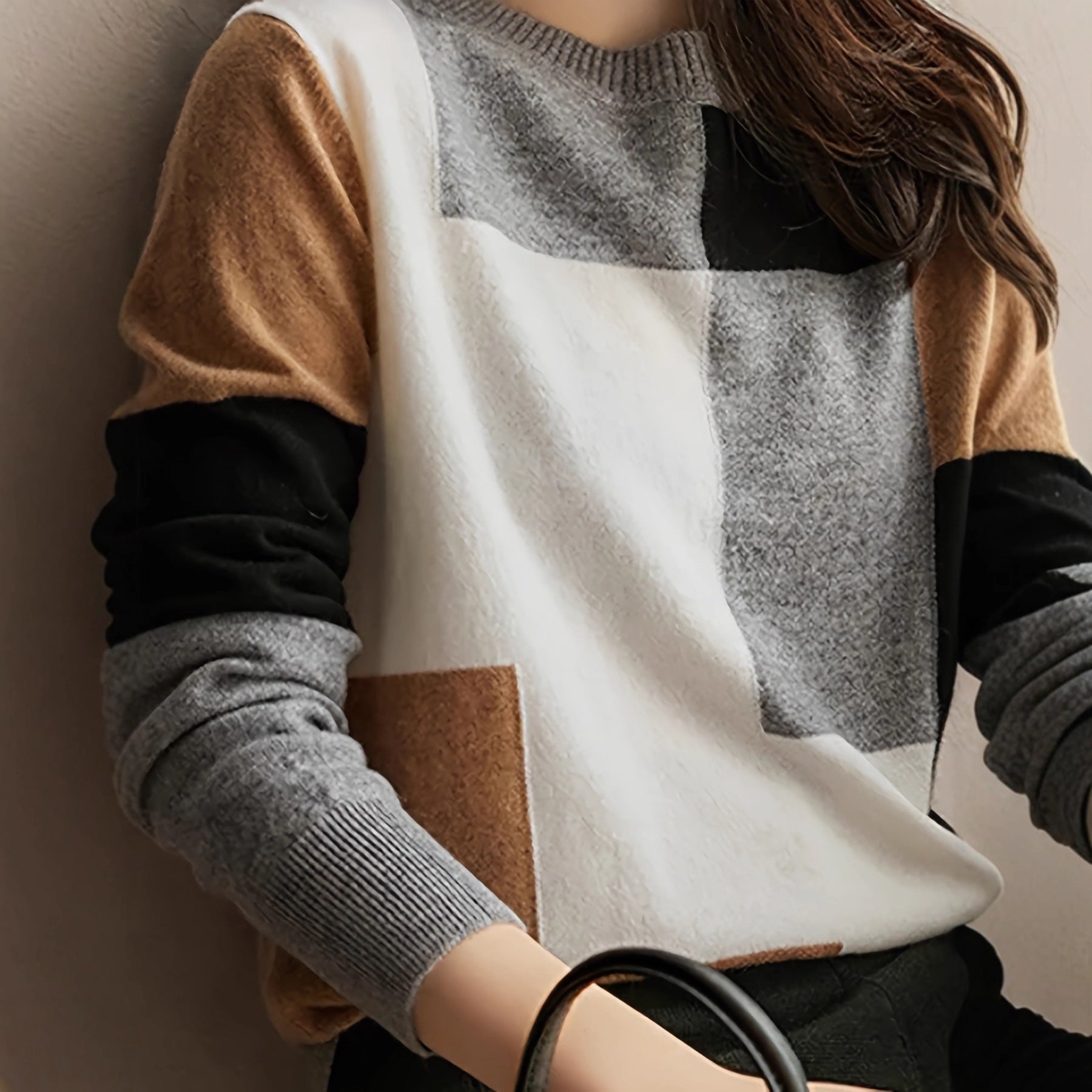 Farbkontrastierter, weicher, anschmiegsamer, langärmeliger, lockerer, figurformender Strickpullover für Damen