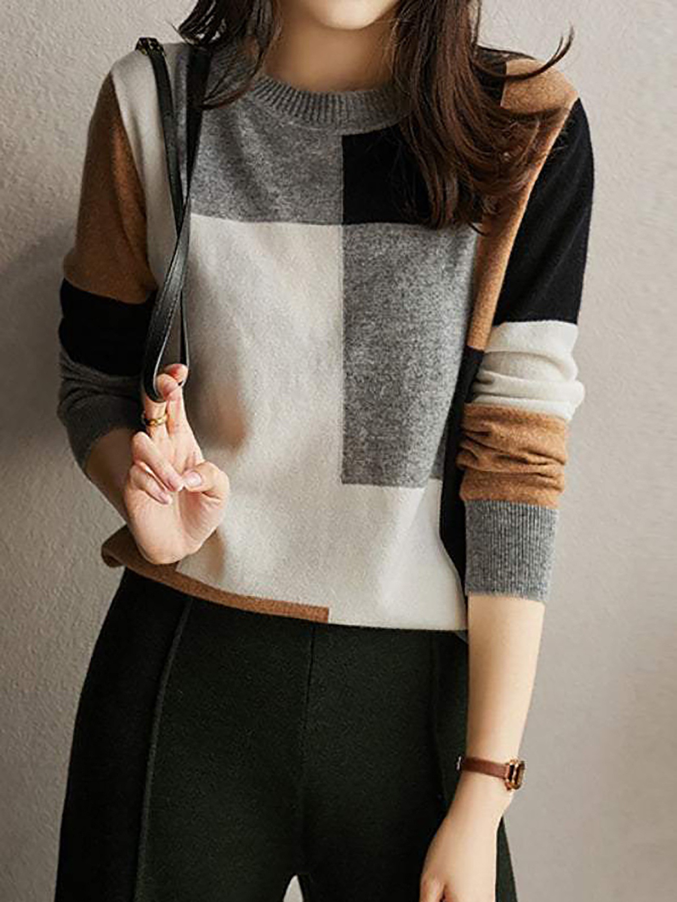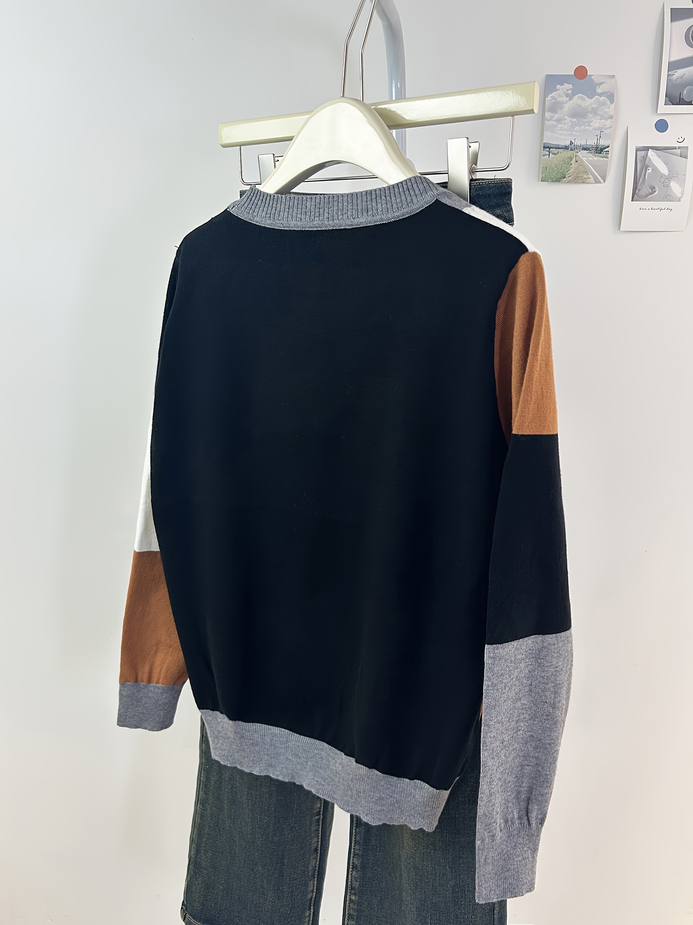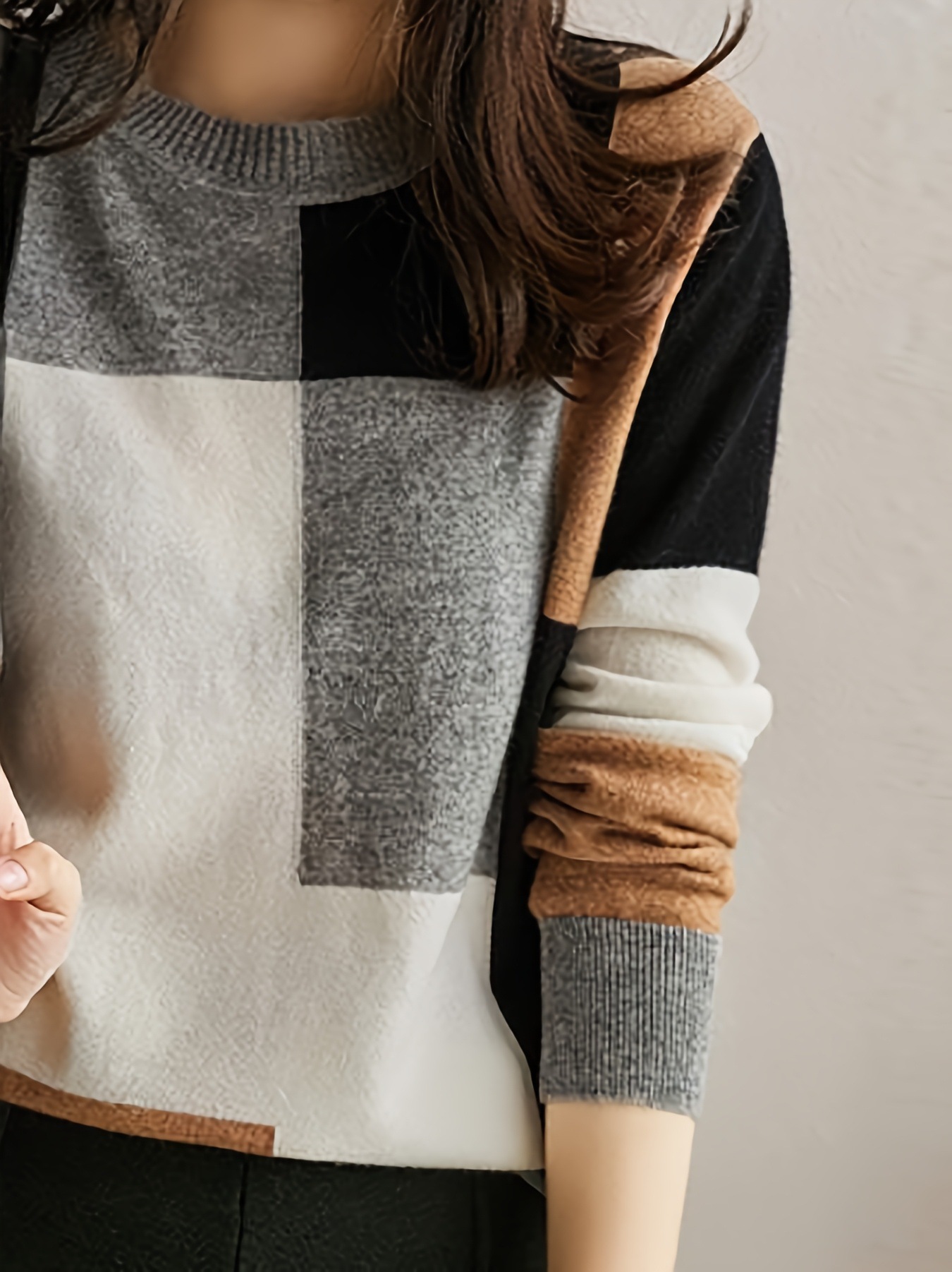 Farbkontrastierter, weicher, anschmiegsamer, langärmeliger, lockerer, figurformender Strickpullover für Damen