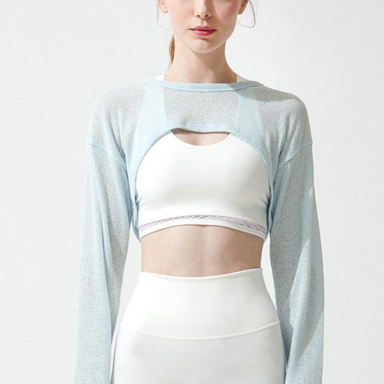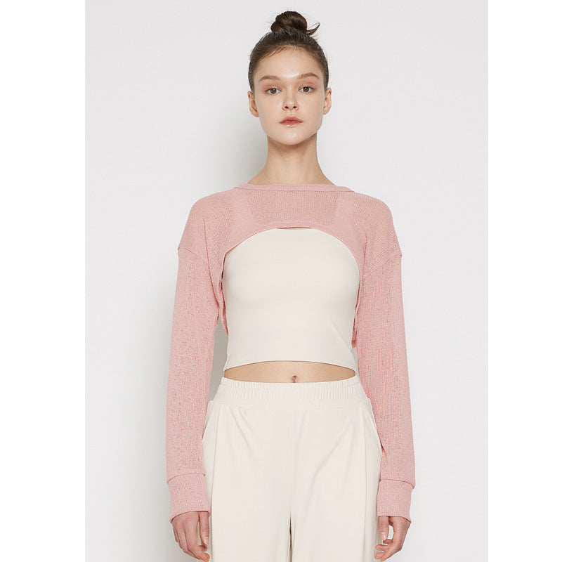 Das Oberteil wird im pullover Stil getragen und ist locker geschnitten. Die Länge endet etwa im Brust-/Oberkörperbereich, wodurch es sich ideal über Sport-BHs, Tops oder Bodys tragen lässt. Mit den zarten Farben Rosa, Hellblau und Hellgelb erhältst du einen femininen und frischen Sport-Look.