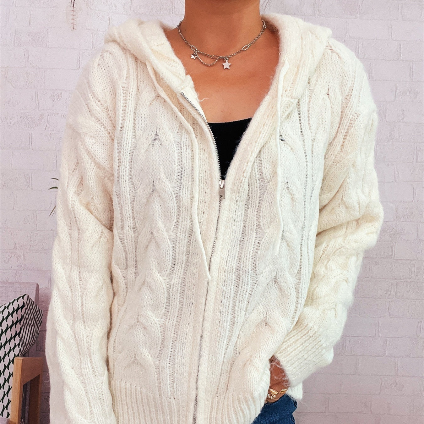Retro-Strickmantel mit Kapuze, Schnürung und Reißverschluss
