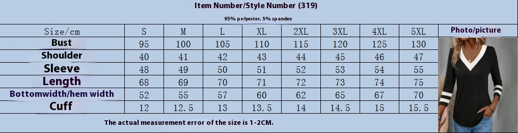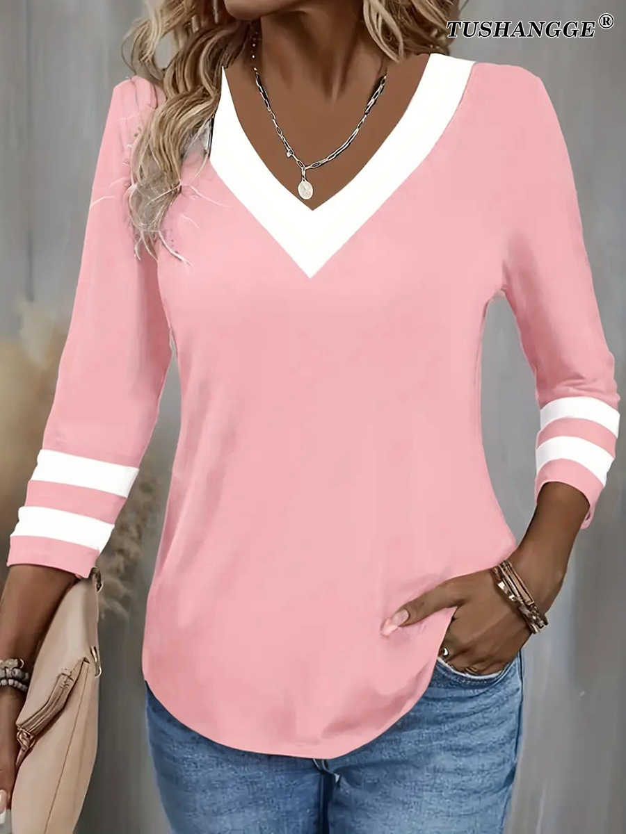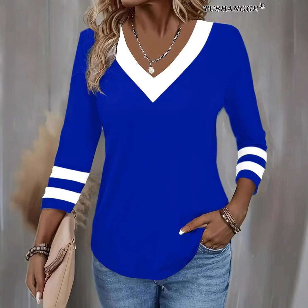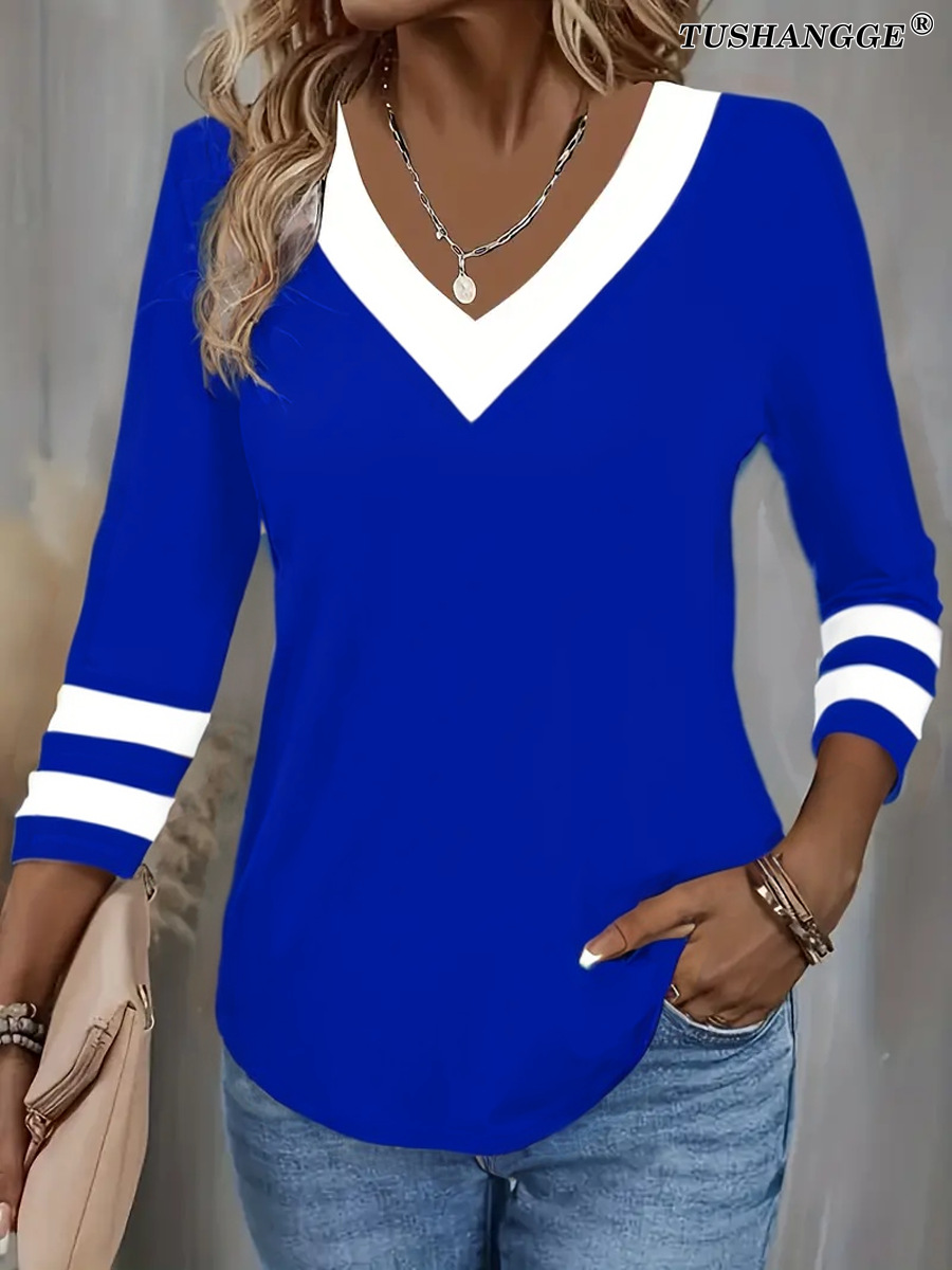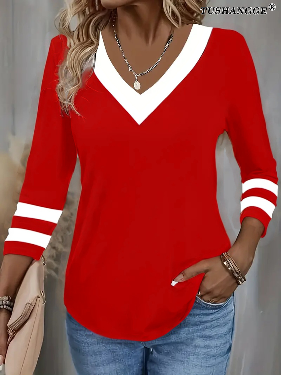 Women's Color Matching Long-sleeved V-neck T-shirt