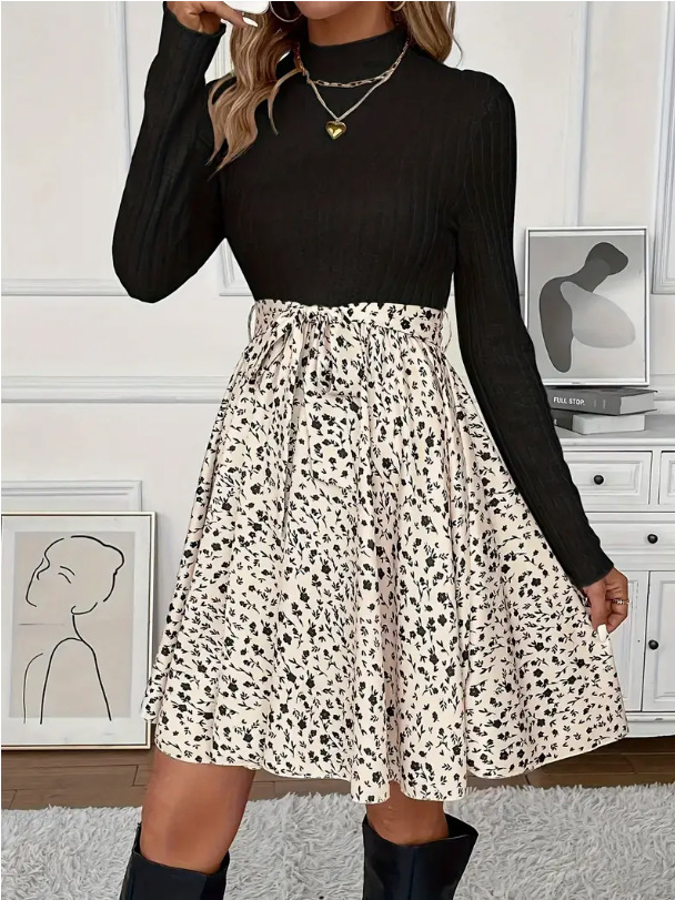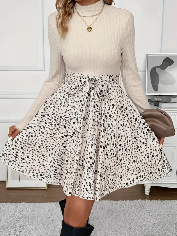 Damen Kleid – Mehrfarbiger Blumendruck, Rundhals