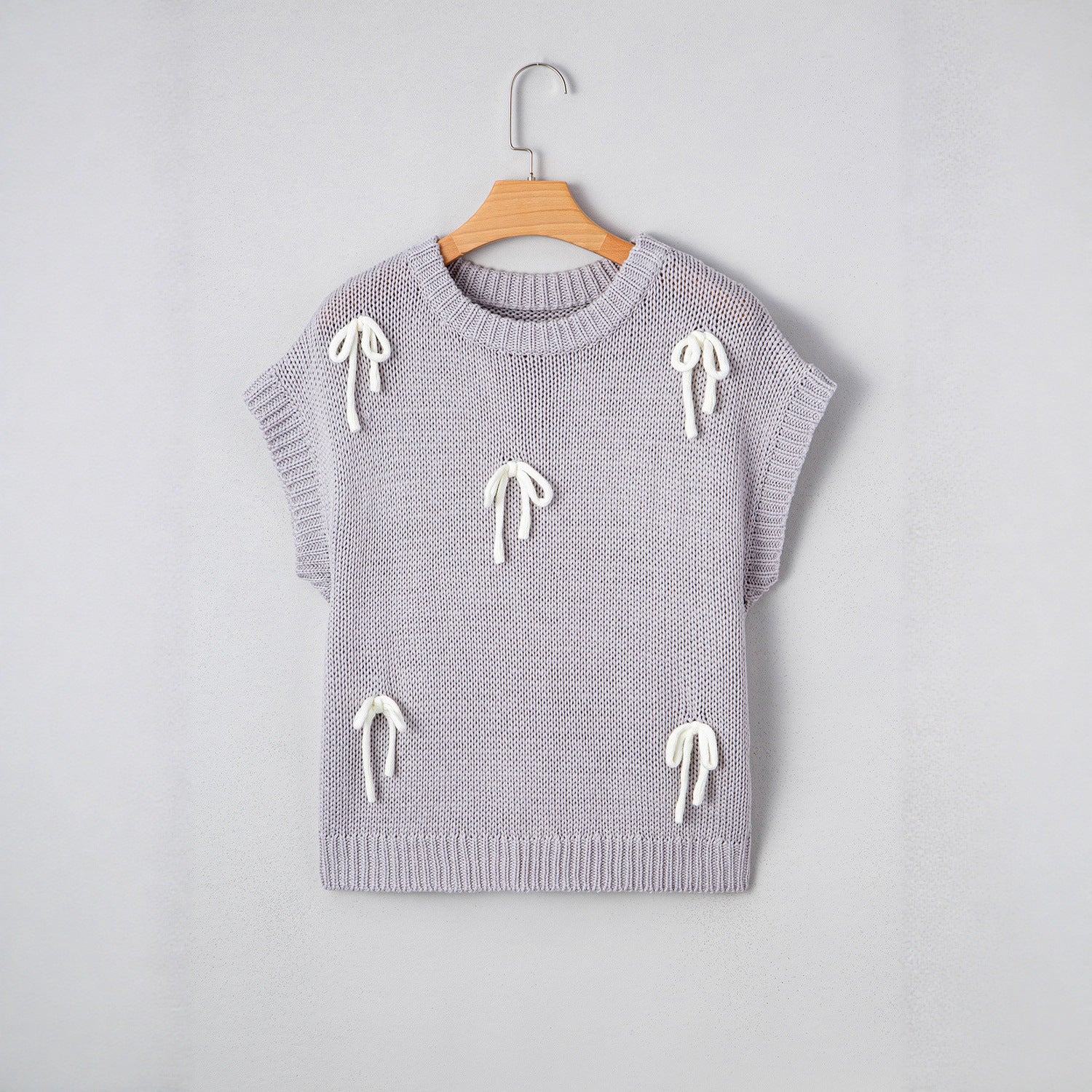 Besonders auffällig sind die Fledermausärmel und das trendige Hollow-Out-Strickmuster, das dem einfarbigen Design in Hellgrau oder Beige mehr Tiefe und Struktur verleiht. Der Pullover wird im klassischen Pullover-Stil über den Kopf gezogen und lässt sich ideal über Tops oder feinen Unterziehshirts stylen.
